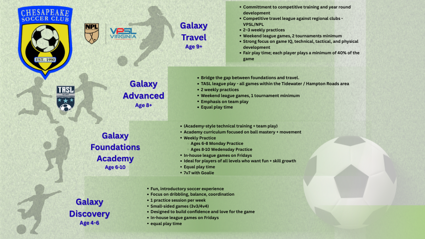 At Chesapeake Soccer Club (CSC), we are committed to providing a positive, inclusive soccer experience for players of all skill levels—from first-time kickers to competitive athletes pursuing advanced play.
